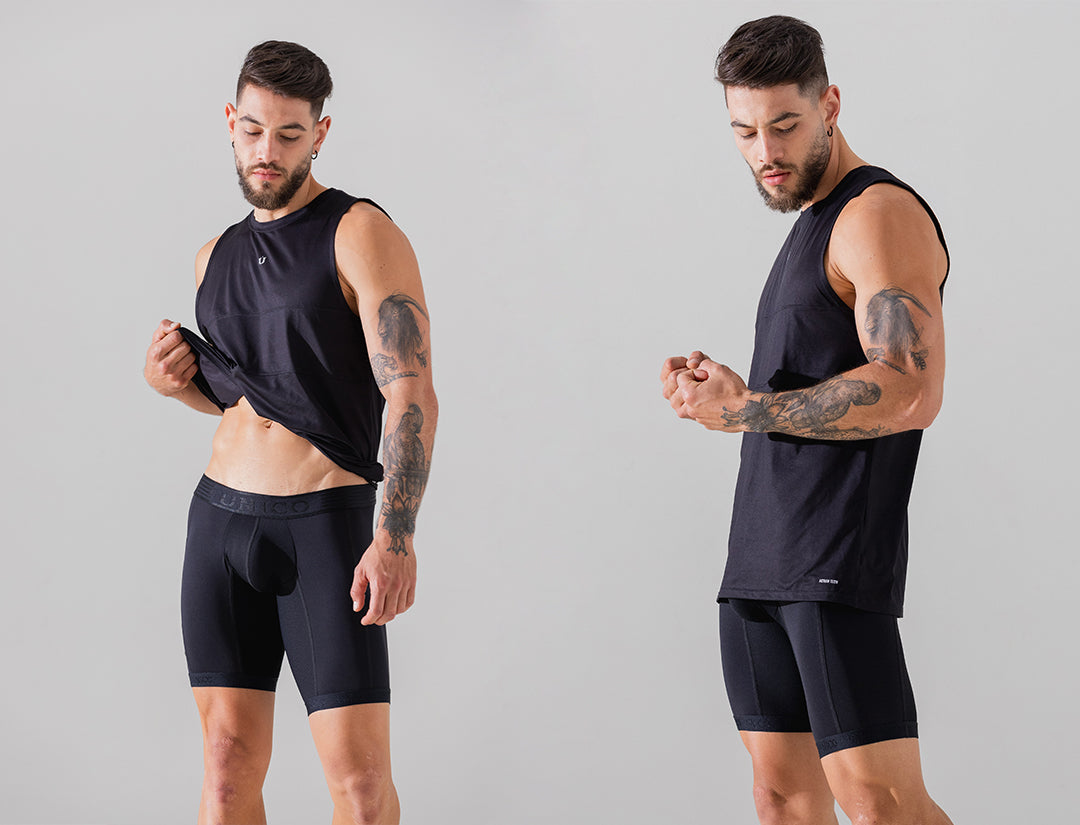 Bóxers deportivos premium eco friendly Silueta: Bóxer athletic. Composición: 58% Poliéster Reciclado, 23% Poliamida, 19% Elastano Diseño / color: Gris estampado con apliques en malla y elástico negro. Inspirado en...