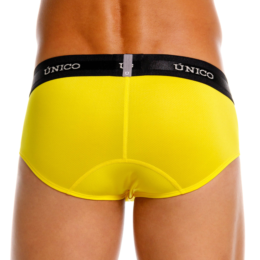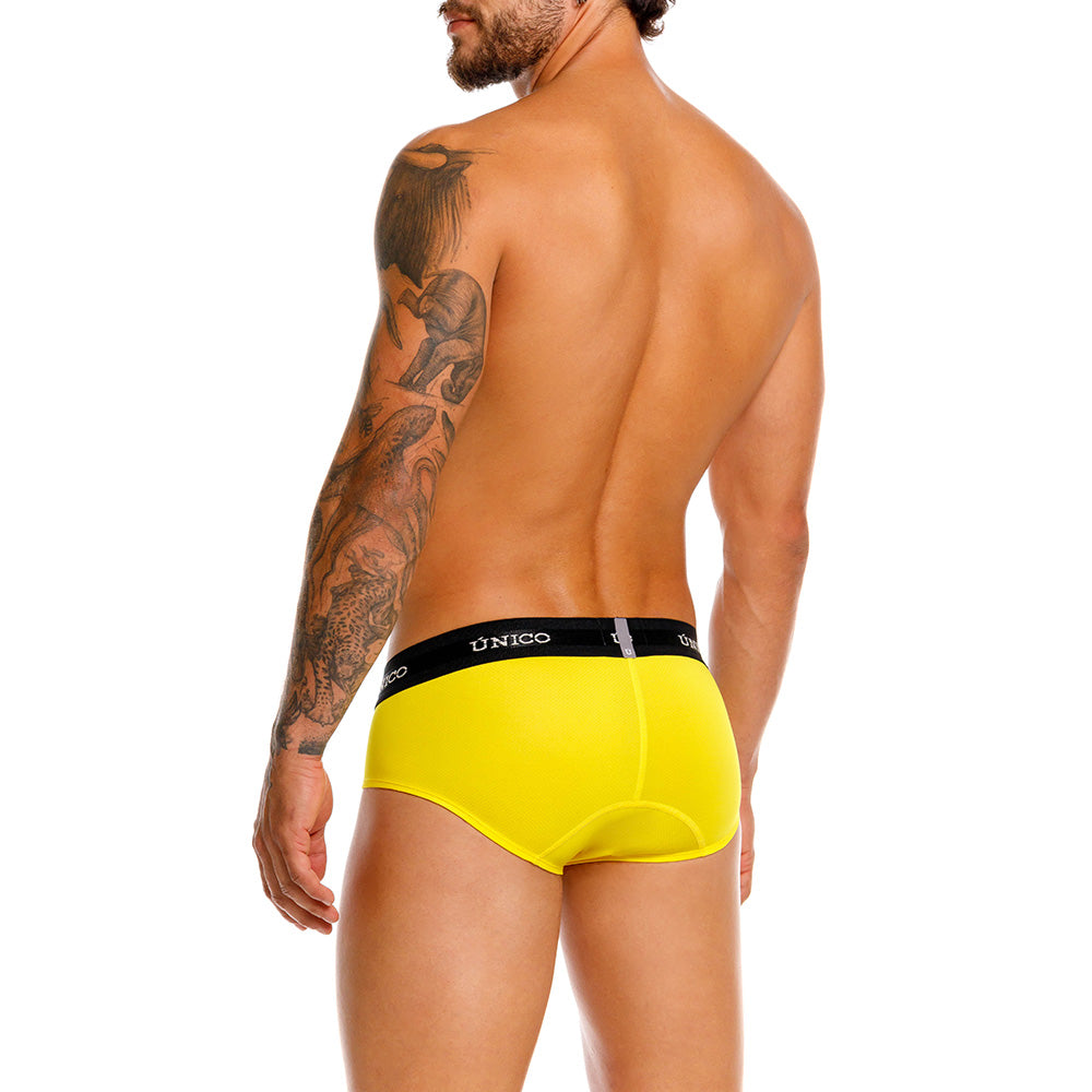 Diseño/color: Tela microperforada amarilla con elástico contramarcado negro.