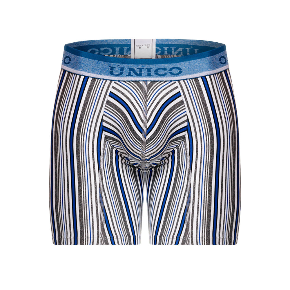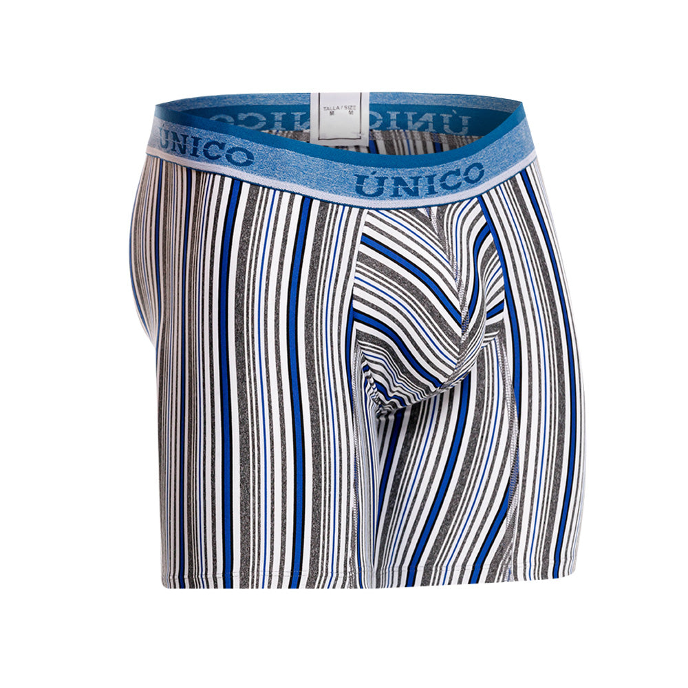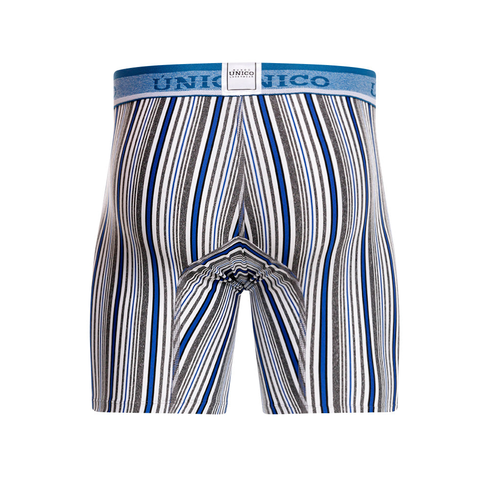 Color: Blanco con rayas grises y azules, con elástico azul contramarcado con detalles azules y blancos.
