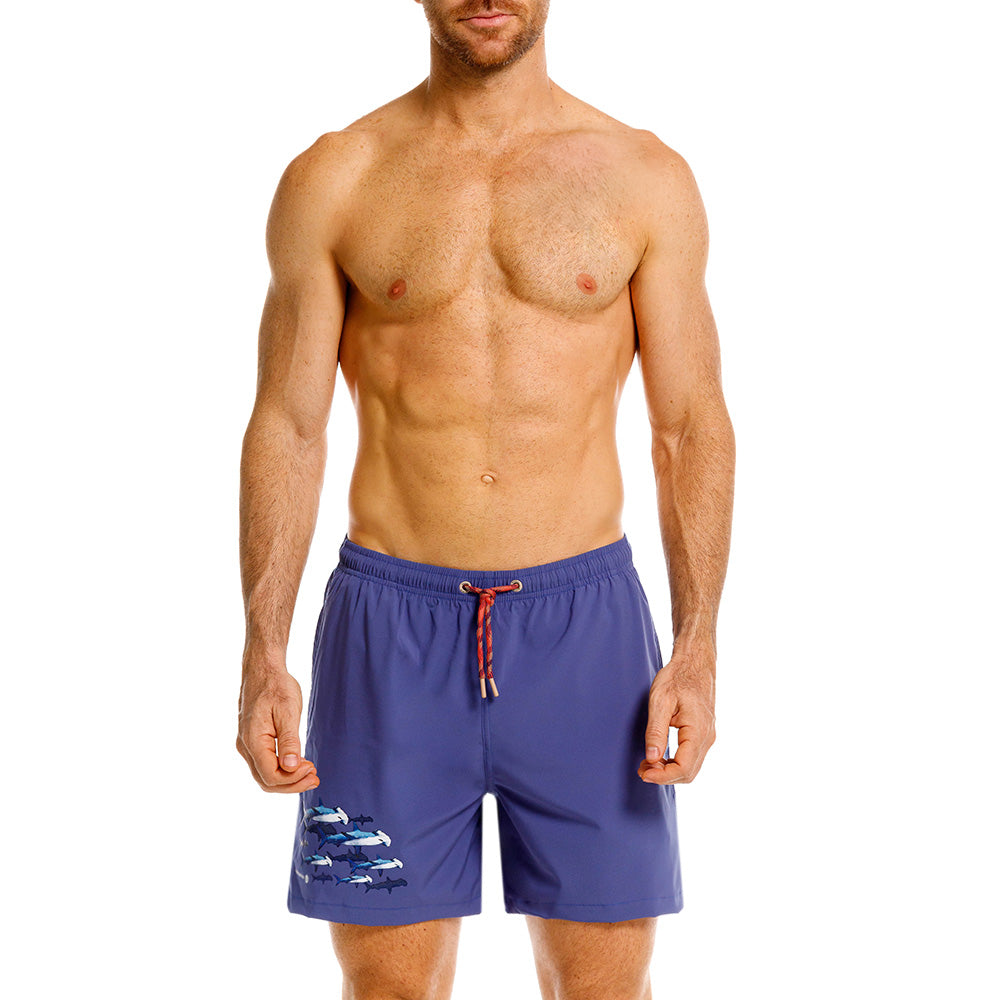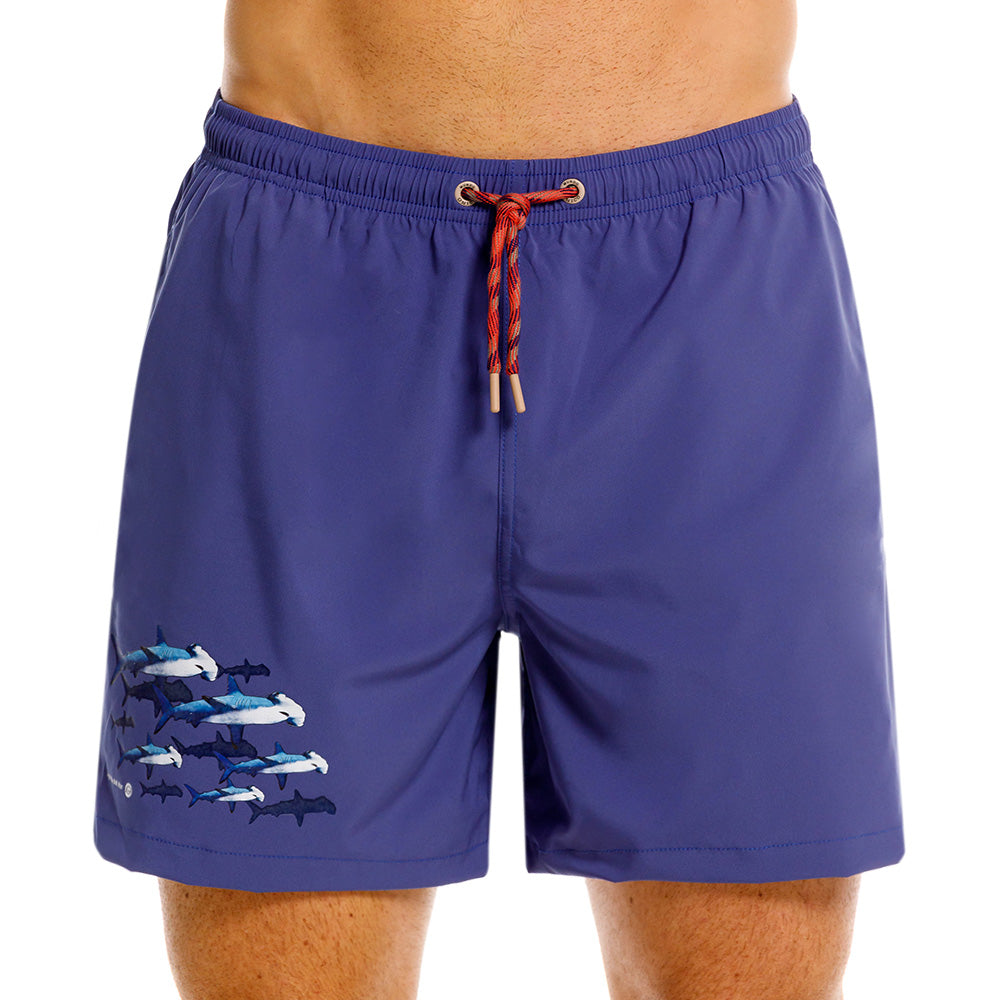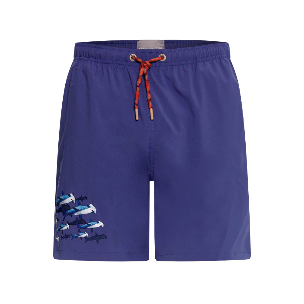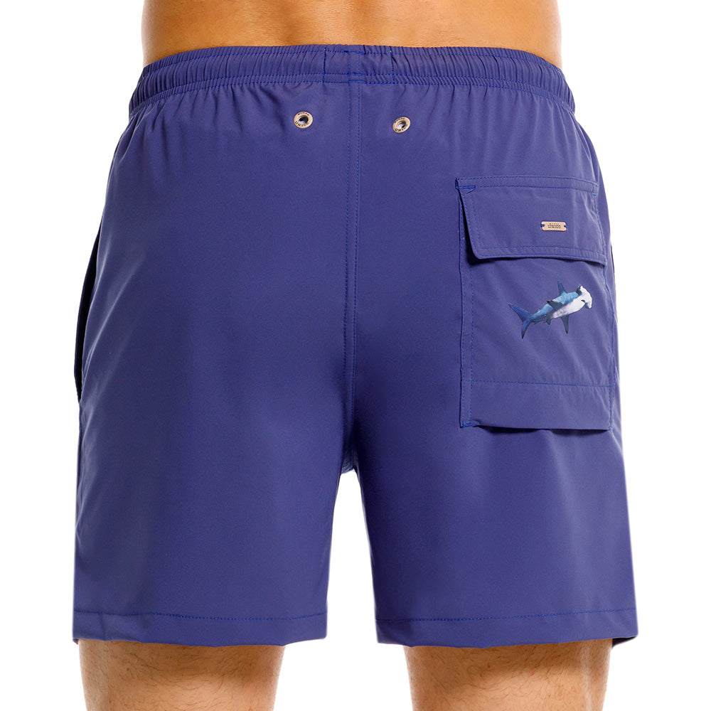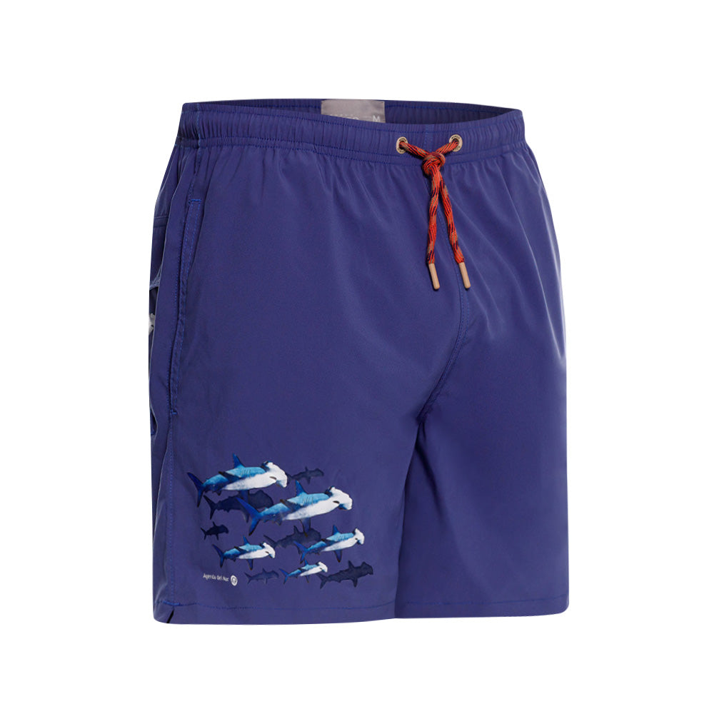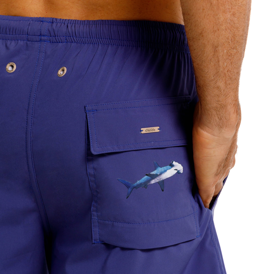 Diseño y color: Azul con estampado de ilustración de tiburones martillo y estampado en bolsillo trasero de un tiburón martillo.